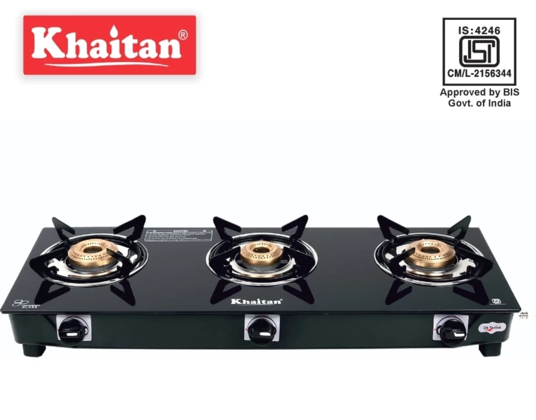 Khaitan 3 Burner BP-JIO Black MS Frame Toughened Glass Manual Gas Stove (3 Burners)